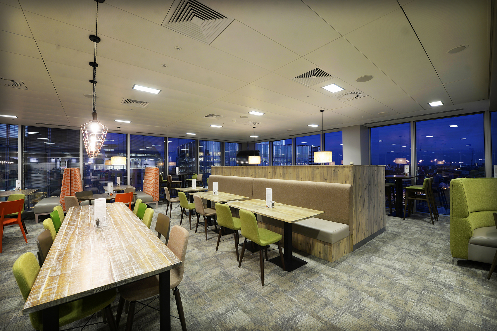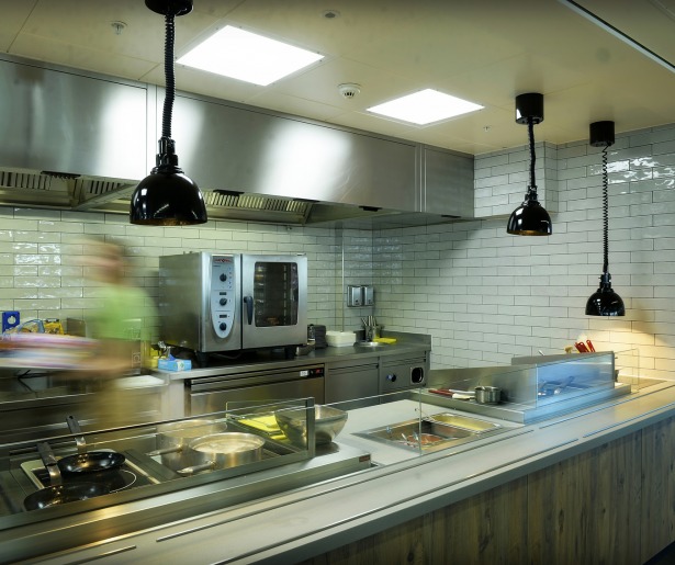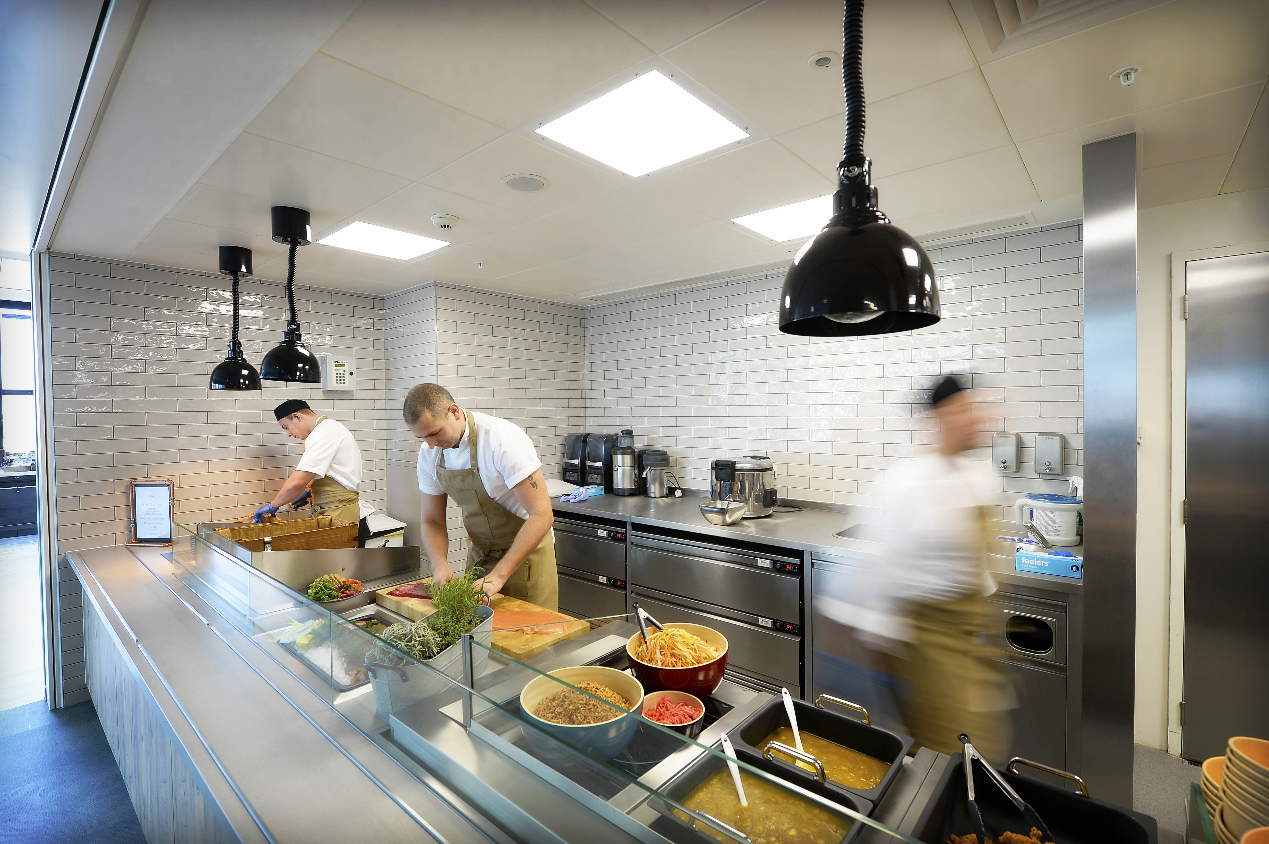 By working closely with the client, we drastically transformed their staff restaurant to enhance food presentation and create a flexible servery to enable offers to be interchanged daily. We achieved this by installing live theatre cooking stations, a sizeable salad counter, a new coffee bar and a grab and go counter for quick service. With the use of natural finishes we have created a market feel to rival the high street.