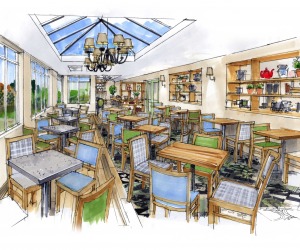 A light and airy, stylish café space to create a special ‘afternoon tea’ experience for customers of all ages. Quirky feature lighting and natural patchwork floor tiles add depth and interest are complemented by natural finishes and bistro-style furniture in soft blue and green check to give the required ‘different, yet traditional’ feel to the space.